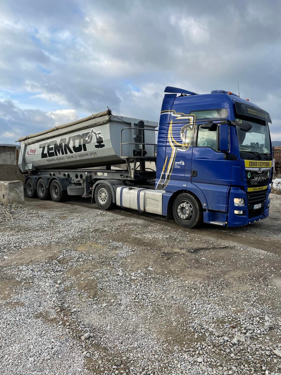 Sklápací náves FLIEGL o objeme 25m3. Ocelový náves na prepravu kameniva,sypkých materiálov, poľnohospodárskych komodít ,stavebnej sute a íného. Užitočná hmotnosť návesu je 27ton.